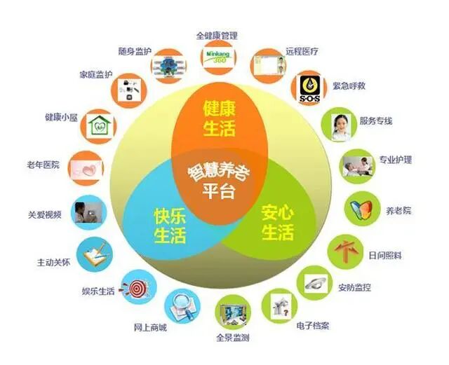 地产是养老产业的载体,以养老院、托老所、护理院为主,老年公寓、老年社区和老年度假村为辅助。而智慧养老,很大程度上体现在养老服务层面,比如医疗服务、生活服务和辅助服务,整体上是围绕着老年群体的吃、穿、用、行、医来展开的。